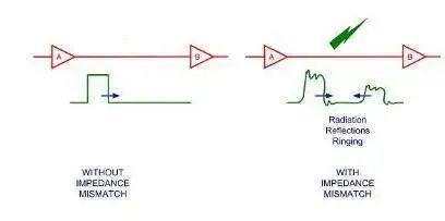 在高频电路中,我们还必须考虑反射的问题。当信号的频率很高时,则信号的波长就很短,当波长短得跟传输线长度可以比拟时,反射信号叠加在原信号上将会改变原信号的形状。如果传输线的特征阻抗跟负载阻抗不相等(即不匹配)时,在负载端就会产生反射。