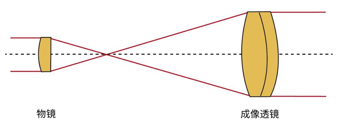 开普勒式扩束系统由两个正焦距的透镜构成,两透镜焦点重合,分别布置在焦距之和的两个位置,靠近物体一侧的透镜叫物镜,靠近眼睛的透镜叫成像镜,在两透镜之间存在一个实像面(光线汇聚处)。
