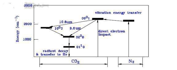 二氧化碳激光是一种分子激光。主要的物质是二氧化碳分子。它可以表现多种能量状态这要视其震动和旋转的形态而定。基本的能量网状见图1。二氧化碳里的混合气体是由于电子释放而造成的低压气体(通常30-50托)形成的等离子(电浆)。如麦克斯韦-波尔兹曼分布定律所说,在等离子里,分子呈现多种兴奋状态。一些会呈现高能态(00o1)其表现为不对称摆动状态。当与空心墙碰撞或者自然散发,这种分子也会偶然的丢失能量。通过自然散发这种高能状态会下降到对称摆动形态(10o0)以及放射出可能传播到任何方向的光子(一种波长10.6μm的光束)。偶然的,这种光子的一种会沿着光轴的腔向下传播也将在共鸣镜里摆动。