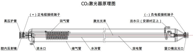CO2激光管中,主要的工作物质由CO2,氮气,氦气三种气体组成。其中CO2是产生激光辐射的气体、氮气及氦气为辅助性气体。有了氦气,可以加速010能级热弛预过程,更有利于激光能级100及020的抽空。氮气加入主要在CO2激光管中起能量传递作用,为CO2激光上能级粒子数的积累以及大功率高效率的激光输出起到强有力的作用。 CO2激光管的激发条件:放电管中,通常输入几十mA或几百mA的直流电流。放电时,放电管中的混合气体内的氮分子由于受到电子的撞击而被激发起来。这时受到激发的氮分子便和CO2分子发生碰撞,N2分子把自己的能量传递给CO2分子,CO2分子从低能级跃迁到高能级上形成粒子数反转发出激光。